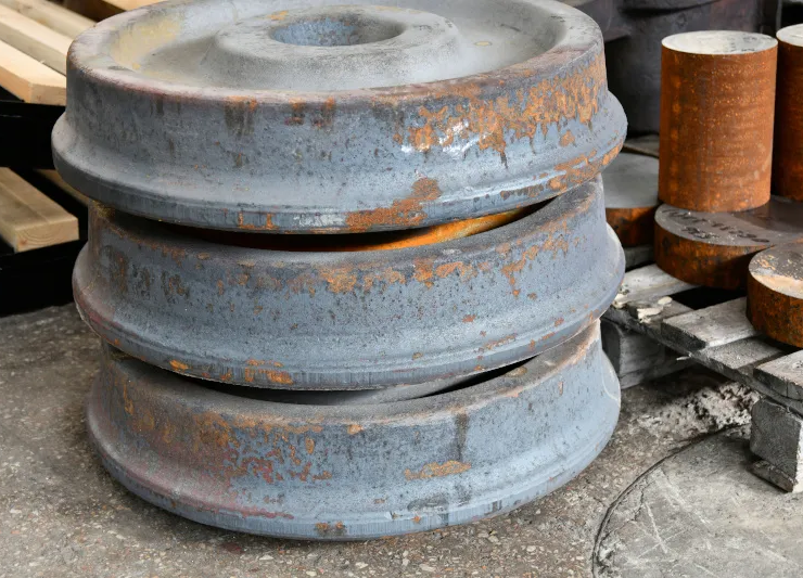 Rozřezané ocelové polotovary se pak pomocí kovacího lisu vytvarují do hrubé podoby kola. Po procesu kování prochází kolo různými obráběcími operacemi, včetně soustružení, frézování a vrtání, aby dosáhlo konečného tvaru a splňovalo požadované tolerance.
