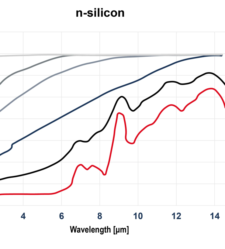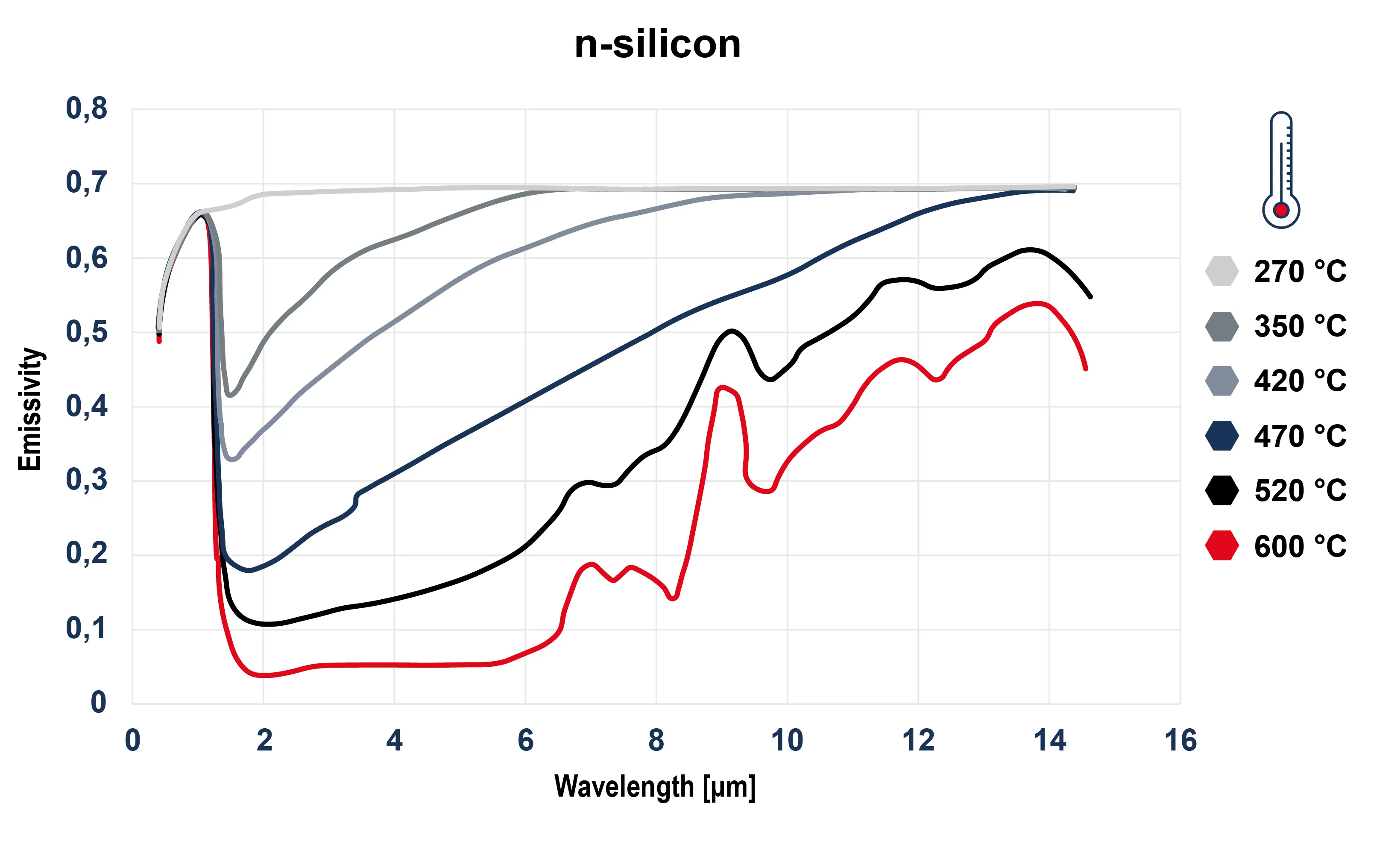 Emisivita křemíku se mění s teplotou, vlnovou délkou a vlastnostmi povrchu, což má za následek komplexní a dynamické chování v různých spektrálních rozsazích. Pro spolehlivé měření teploty křemíku se doporučuje používat krátkou infračervenou vlnovou délku kolem 1 µm, kde emisivita zůstává stabilní i přes změny teploty. Dvoubarevné pyrometry mohou být výhodné, protože nevyžadují vyplnění celého zorného pole pro měření teploty tyče. Lze je použít v nevýbušném pouzdře, pokud je přítomen plynný vodík.