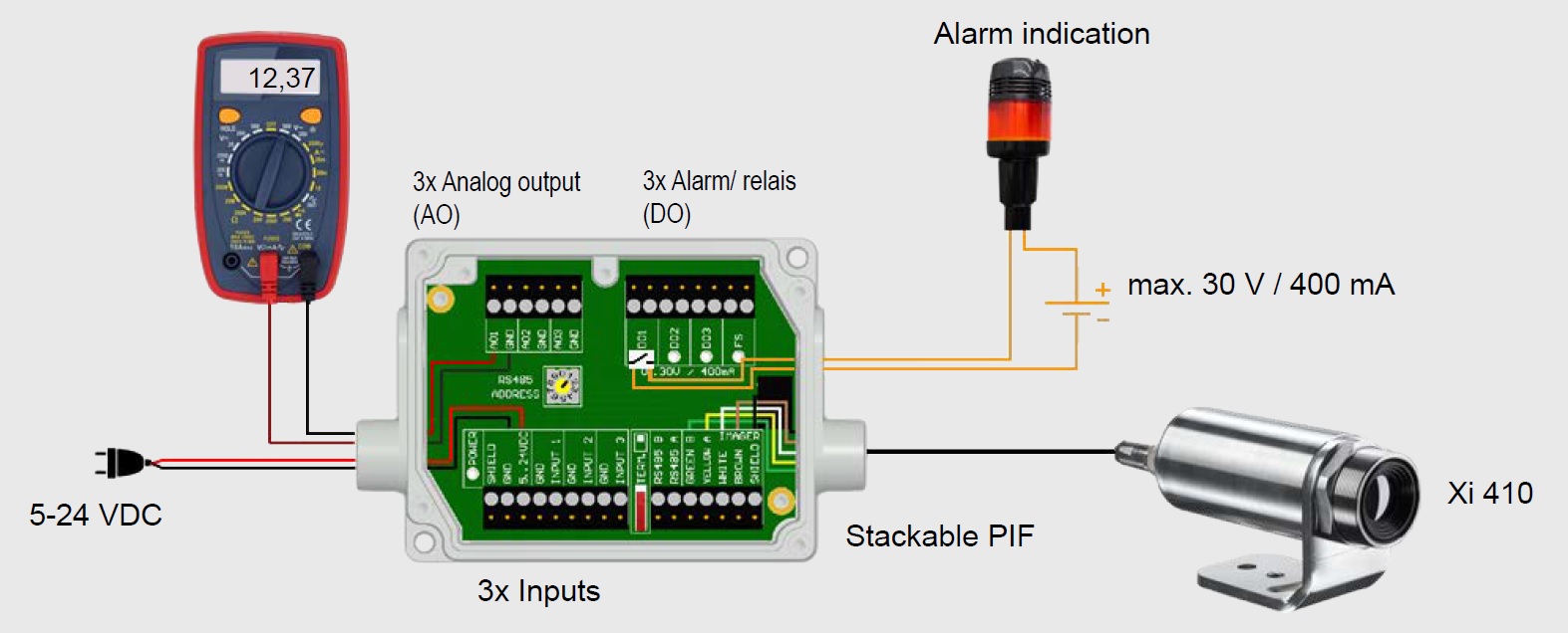 Voliteľne externý box s elektronikou (PIF) - 3x analógový výstup (0/4–20 mA alebo 0–10 V) alebo výstup na alarm (relé), 3x vstup (analógový alebo digitálny)